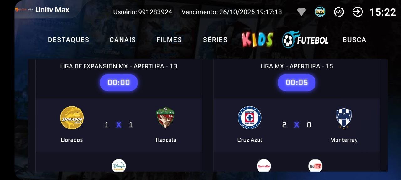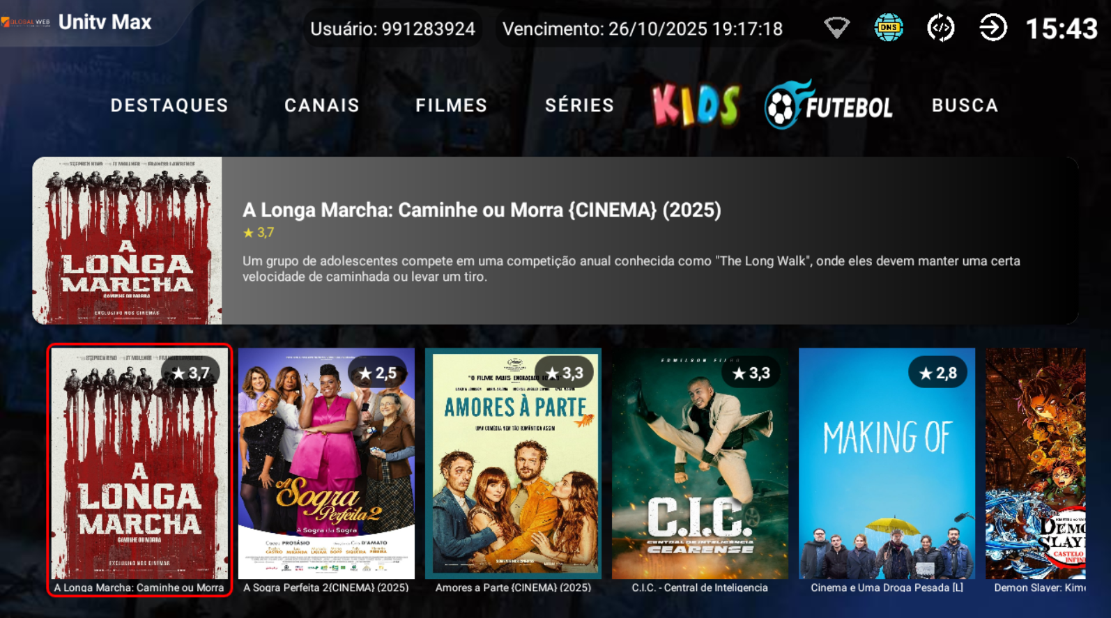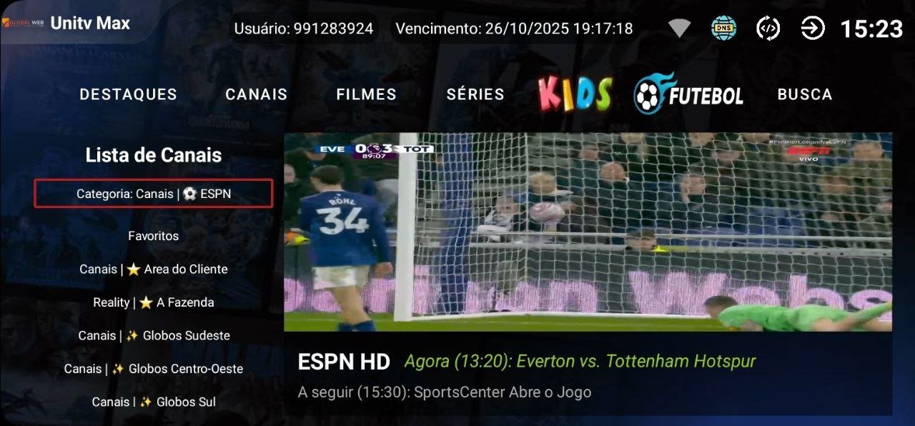 ✅ Menu principal com seções: Destaques, Canais, Filmes, Séries, Kids, Futebol e Busca.